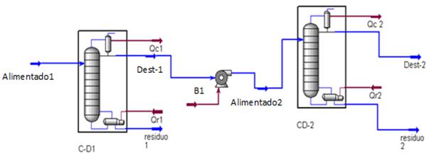 Dest-1 y Dest-2: destilado obtenido en las columnas de destilación 1 y 2, respectivamente (en la figura 1)