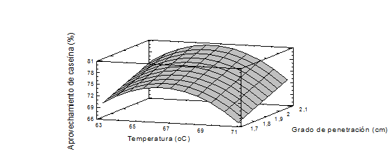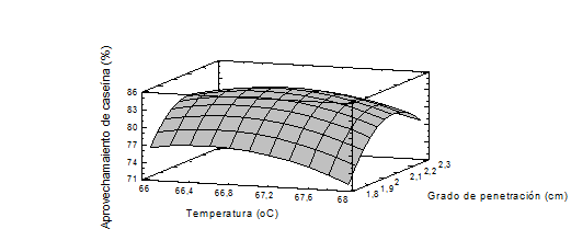 De acuerdo a este resultado se decidió tomar como variable de respuesta para la optimización, el aprovechamiento de caseína. La figura 1 presenta el gráfico de superficie, donde se puede observar claramente que el máximo aprovechamiento de caseína fue para la temperatura de pasteurización 66,5 ºC y para el grado de penetración 2,1 cm. En el caso de la temperatura se pudiera hablar de un valor óptimo, sin embargo para el grado de penetración resultó estar situado en uno de los puntos extremos de la experimentación, no quedando claramente definido el óptimo integral.