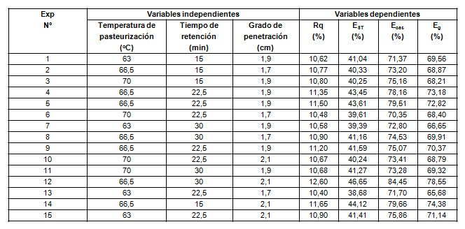 El análisis estadístico del experimento dio como resultado para las tres variables dependientes que las únicas significativas fueron el grado de penetración en forma lineal (hp) positiva y la temperatura de pasteurización en su forma cuadrática (Tp2) negativa, mientras que el tiempo de retención en la pasteurización no fue significativo en forma alguna. Los valores del coeficiente de determinación (R2) fueron muy similares para las cuatro variables dependientes (rendimiento 77,64 %; aprovechamiento de sólidos totales 77,12 %; aprovechamiento de caseína 77,62 % y aprovechamiento de grasa 76,18 %)