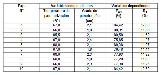 Los valores óptimos de las variables independientes, según el programa, fueron: temperatura de pasteurización 66,8 oC (67,0 oC) y grado de penetración 2,08 cm (2,1 cm).