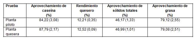 Para esas condiciones el valor estimado del aprovechamiento de caseína fue de 84,37 %, que resulta muy bueno en una producción comercial en condiciones artesanales.