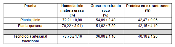 La diferencia fundamental de este queso con respecto al artesanal tradicional (1) estuvo dada por la humedad sin materia grasa ligeramente menor, contenido de grasa en extracto seco mayor y de forma muy marcada, así como contenido de proteína ligeramente mayor.