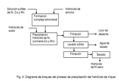 La precipitación química del hidróxido de níquel ha sido estudiada por diferentes investigadores. Uno de los procesos más utilizados consiste en hacer reaccionar una solución de una sal de níquel, (sulfato, nitrato u otra) con un donador del ión amonio para formar un complejo de níquel, que luego, se pone en contacto con una base alcalina fuerte (preferiblemente hidróxido de sodio), bajo condiciones controladas de temperatura, pH, tiempo de residencia. 3-7 Algunos de estos procesos, con la finalidad de mejorar las propiedades electroquímicas del hidróxido de níquel para su utilización en el electrodo positivo de las baterías recargables, incluyen la adición de diferentes elementos metálicos a la solución de níquel, tales como: cobalto, manganeso, zinc, entre otros (8-11), cuyas cantidades deben mantenerse dentro de valores límites que no reduzcan la capacidad de la celda, específicamente, la energía por peso del electrodo. 12,13) También, se ha obtenido hidróxido de níquel de morfología fundamentalmente esférica, con densidad de compactación en el rango de 1800 a 2300 kg/m3. Esta última característica es importante para garantizar más cantidad de energía por unidad de volumen de la batería. 3,14