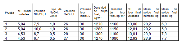 En la tabla 2, se muestra el comportamiento de los diferentes parámetros medidos durante las pruebas. En todos los casos, se cumplió con los valores pre-fijados de temperatura y tiempo de reacción, iguales a 70 oC y una hora, respectivamente, que fueron las condiciones bajo las cuales se obtuvieron las mayores eficiencias de precipitación de metales de las pruebas de laboratorio. 15 El tiempo que duró la adición de solución de hidróxido de sodio hasta alcanzar el pH de trabajo, osciló entre 1 h y 15 min y 1 h y 30 min. Para efectuar el lavado, se emplearon 100 L de agua en cada prueba.