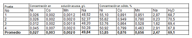 En la tabla 6, se reflejan los resultados de la composición química del hidróxido de níquel obtenido a escala piloto, después de haber sido lavado en el laboratorio, utilizando agua a 70 oC en cuatro etapas.