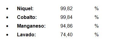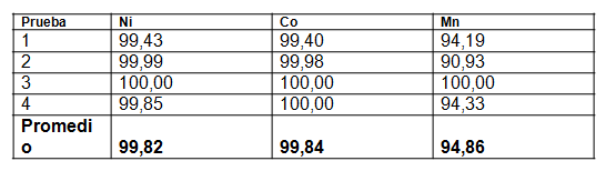La eficiencia de precipitación del níquel, el cobalto y el manganeso, se comportó como sigue: