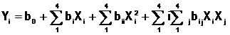 Donde Yi es la respuesta predicha, Xi, Xj son variables de entrada que influyen en la variable de respuesta Y; b0 es el término de compensación; bi es el iésimo coeficiente lineal; bii es el coeficiente cuadrático y bij es el ij-ésimo coeficiente de interacción. Los rangos y niveles de las variables independientes investigadas en este estudio se presentan en la tabla 1.