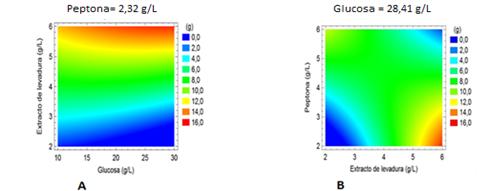 En el presente trabajo se empleó peptona y extracto de levadura como fuentes de nitrógeno, y sus concentraciones tuvieron un efecto significativo en la formación de biomasa. Aunque la concentración de extracto de levadura no tuvo un efecto estadísticamente significativo en la formación de biomasa se observa en la (Fig.2A) que el aumento de la concentración de extracto de levadura tuvo una tendencia a incrementar la formación de biomasa, alcanzándose mayores valores para concentraciones superiores a 5 g·L-1. Por otra parte, el aumento de la concentración de peptona tiende a reducir los valores de biomasa (Fig. 2B). En este caso los mejores valores se encontraron para concentraciones mínimas de peptona por debajo de los 3,5 g·L-1.
