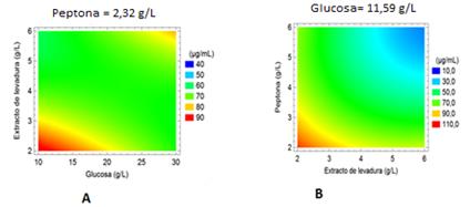 La figura 3 revela que las tres variables tienen un efecto similar sobre la producción de fenoles totales. La interacción de la concentración de glucosa con ambas fuentes de nitrógeno es de naturaleza lineal. Sin embargo, en este caso, el efecto de la glucosa es contrario, ya que los mayores valores en la concentración de fenoles (>80 µg·mL-1) se alcanzaron para concentraciones de glucosa por debajo de los 20 g·L-1. El aumento de la concentración de extracto de levadura y peptona tuvo un efecto inhibidor de la producción de compuestos fenólicos y los niveles óptimos para ambas variables se encuentran por debajo de los 4 g·L-1.