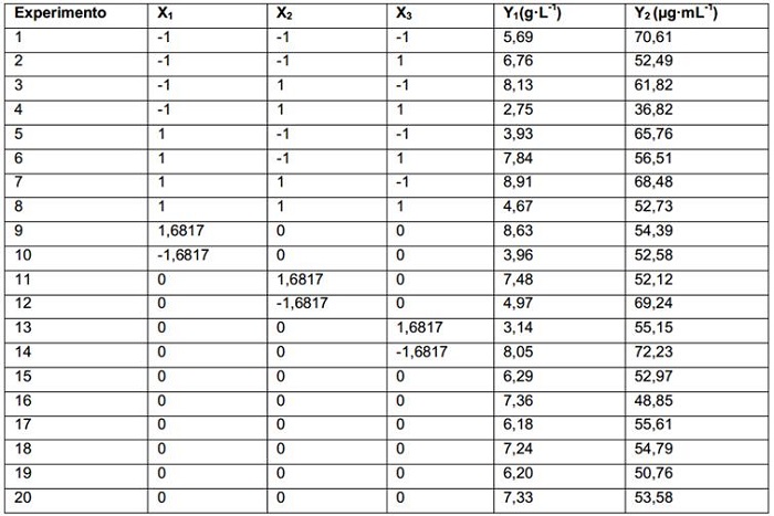 Se varió la concentración de glucosa, peptona y extracto de levadura, debido a que son las fuentes de carbono y nitrógeno. Los restantes componentes del medio se mantuvieron constantes. Se empleó un diseño compuesto central. Los valores centrales (nivel cero) elegidos para el diseño experimental fueron: glucosa 20 g·L-1, extracto de levadura 4 g·L-1 y peptona 4 g·L-1. Las variables de respuesta fueron ajustadas a un modelo de segundo orden. (12