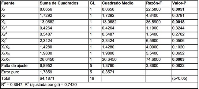 En la tabla 3 se presenta el análisis de varianza del modelo ajustado a los datos de la obtención de biomasa y el coeficiente de determinación (R2) igual a 0,8647 indica que el modelo ajustado explica el 86,47 % de la variabilidad total en la respuesta y el 13,53 % de variabilidad restante corresponde al error total.