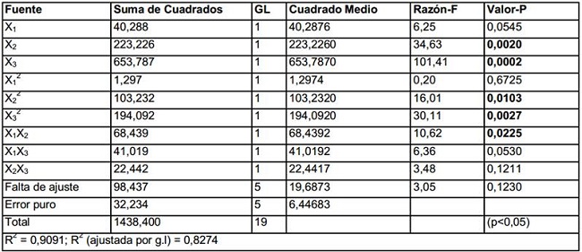 En el análisis de varianza (tabla 4) se puede apreciar que existen cinco términos significativos (p<0,05): la concentración de extracto de levadura (X2) y su cuadrado (X2 2), la concentración de peptona (X3) y su cuadrado (X3 2) y la interacción entre glucosa y el extracto de levadura (X1X2). Estos resultados indican que, para este intervalo de concentraciones, la formación de fenoles totales parece ser especialmente sensible a la cantidad de nitrógeno total presente en el medio. El valor de R2 = 0,9091 indica que el modelo ajustado explica el 90,91% de la variabilidad total en la respuesta y el 9,09% de variabilidad restante corresponde al error total. Estos valores son adecuados para este tipo de modelo, teniendo en cuenta la complejidad del metabolismo de los hongos superiores.