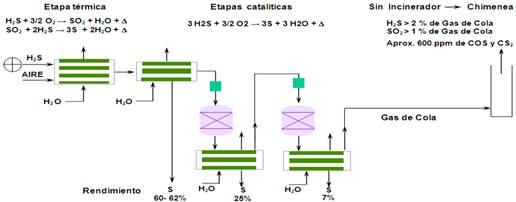 En la URA convencional se logra una recuperación entre 94-96%, según las tecnologías de Linde Group, Chematek S.p.A, Siirtec Nigi,9,10,11 entre otras, lo que resulta insuficiente para el cumplimiento de las normas de emisiones antes mencionadas. Para cumplirlas será necesaria la adición de una unidad de tratamiento de gas de cola, según Lurgi, Worley Parsons, Prosernat, (12 lo cual encarece el proceso de recuperación de azufre.