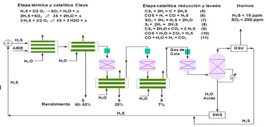 El proceso Claus se utiliza en refinerías y plantas de gas para la recuperación de azufre elemental a partir del sulfuro de hidrógeno (H2S) contenido en los gases ácidos, que se producen durante la regeneración de aminas y los generados durante el despojamiento de las aguas agrias del craqueo catalítico y otros procesos.5,6 Sin embargo la conversión completa del H2S en azufre, está impedida por limitaciones termodinámicas de las reacciones que tienen lugar en dicho proceso.7,8