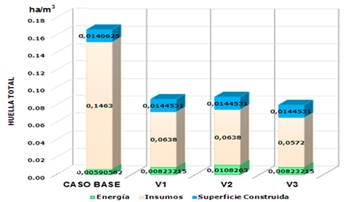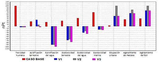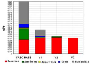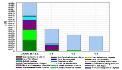 Para el análisis se mantuvieron los valores de entrada y salida de aquellos elementos que no varían y se modeló con el método Eco-Speed. Las figuras 4, 5 y 6 muestran la comparación por categorías de impactos entre los procesos de las 3 variantes propuestas.