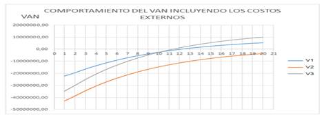 Del procesamiento de los flujos de caja de las variantes se obtuvieron los resultados de VAN, TIR y PRD, para cada una de ellas, incluyendo los costos externos mostrados en la tabla 2, así como en la figura 8. Los costos externos se restan del total de ingresos por ventas, para mayor precisión en el análisis.