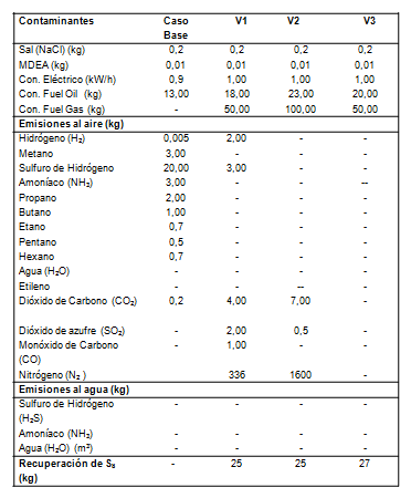 La mayor contaminación se produce en la variante del Caso Base, porque logra disminuir todas las emisiones al agua y recuperar esta para usarla nuevamente en el proceso, no obstante, convierte todos los compuestos sulfurosos (H2S) presentes en el agua a contaminación del aire, luego del despojamiento.
