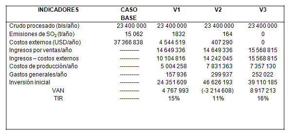 En el análisis económico realizado considerando el valor de las externalidades provocadas por las emisiones de SO2 en la refinería estudiada, tomando como referencia el Caso Base de la refinería actual, para la cual se calcularon las emisiones aplicando la metodología de cálculo de la CEPAL-SEMARNAT en la refinería de Salamanca, México, según las ecuaciones 12 y 13 y las externalidades fueron calculadas por la ecuación 14. Las emisiones por variantes se calcularon de acuerdo al balance de materiales adaptado a 1 m3 de agua residual sulfurosa y multiplicado por el volumen de consumo de dicha agua. La cantidad de crudo procesado para el caso base y para cada variante es la misma y fue tomada de las cuentas de producción de la refinería de Cienfuegos.