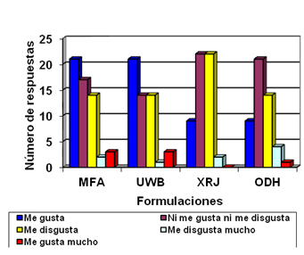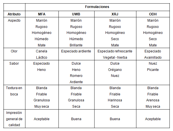 De las cuatro formulaciones solo dos resultaron con impresión general de buena (UWB, XRJ) y dos de aceptable (MFA, ODH). Las formulaciones fueron sometidas a la evaluación por personas potencialmente consumidores