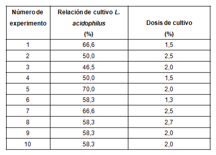 Para el diseño se utilizó un factorial Superficie de Respuesta mediante el programa STATGRAPHICS Centurion45 siendo las variables independiente relación de cultivo (1:1 a 1:2) y dosis de cultivo (1,5 a 2,5 %), como variable de respuesta se utilizó la viabilidad. La matriz del diseño se presenta en la tabla 1.