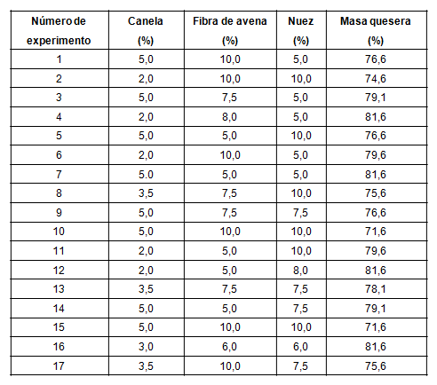 Para el diseño se consideró un sistema de mezcla haciendo uso del programa Design- Expert,46 donde se consideró mantener constante los condimentos romero (2 %), orégano (0,4 %) y pimentón (1 %) según lo reportado9,47 y se consideraron como variables independientes canela (2 a 5 %), fibra de avena (4 a 6 %), nuez de castilla (5 a 10 %) y masa quesera (71,6 a 81,6 %). Como variables de respuesta se tomaron la aceptabilidad y la viabilidad. La matriz del diseño de experimento se presenta en la tabla 2.