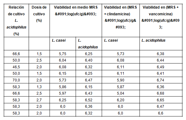 La viabilidad se determinó mediante el método de siembra en placas utilizando como medio el MRS, el suplemento antibiótico que se añadió al medio MRS para aislar L. casei fue la vancomicina a una concentración de 1 mg/L y para el aislamiento de L. acidophilus se utilizó la clindamicina a una concentración de 0,1 mg/L. La incubación se realizó a una temperatura de 37 ºC y el conteo de los microorganismos se llevó a cabo a las 72 horas en las diferentes diluciones decimales.