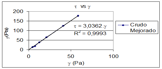 Como se observa en la figura 1, la relación esfuerzo cortante vs gradiente de velocidad es una línea recta con intercepto en cero, lo que corresponde a un comportamiento reológico newtoniano, en el que la viscosidad del crudo es la pendiente de la recta que ajusta los puntos obtenidos y cuyo valor es de 3.0362 Pa.s.2 El coeficiente de regresión obtenido es R²=0.9999, lo que indica la calidad del ajuste obtenido.