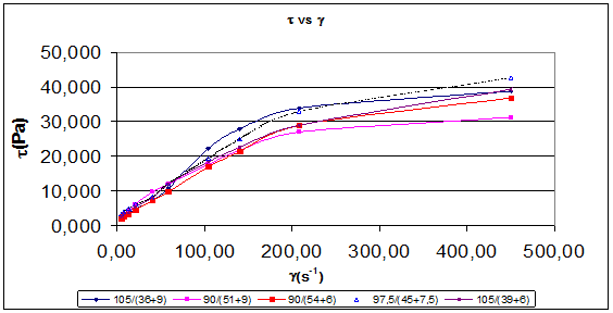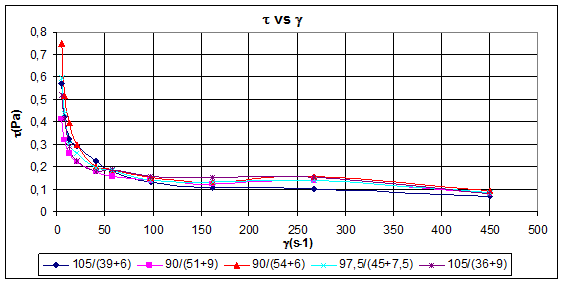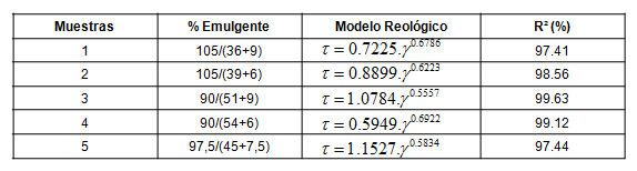 En la figura 2 se muestra el gráfico de esfuerzo cortante vs gradiente de velocidad, para cada una de las relaciones de la tabla 2, en el que se puede observar que las curvas siguen todas un comportamiento reológico seudoplástico, en que los mayores cambios de esfuerzo cortante producidos en la emulsión se observan para gradientes de velocidad bajos (entre 4.5 y 150 s-1), además de que para los mismos gradientes de velocidad la relación 90/54+6 es la que menor esfuerzo cortante requiere.