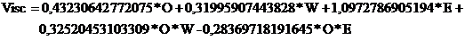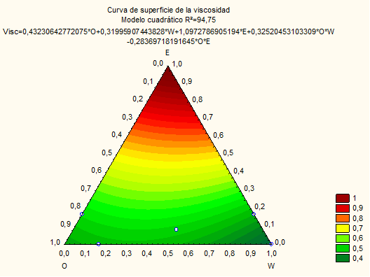 En la figura 4 se observa una curva de superficie de la viscosidad en función de las fracciones de petróleo, agua y emulgente, obtenida a partir del modelo obtenido. Este gráfico permite predecir el valor de viscosidad conociendo las fracciones tanto por uno de cada componente de la mezcla.