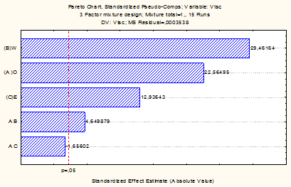 En la figura 5 se muestra la influencia de cada uno de los componentes (petróleo, agua y emulgente sobre la viscosidad de la emulsión. En el mismo se puede observar que los parámetros que mayor influencia ejercen sobre la viscosidad son la fracción de agua, la de petróleo, la de emulgente y la de la relación petróleo agua. En el caso de la relación petróleo-emulgente se puede despreciar.