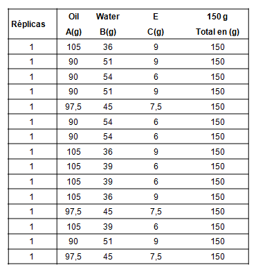 Se realizaron 15 corridas experimentales, que corresponden a cinco relaciones de petróleo/agua+emulgente, y para cada una de ellas se realizaron 2 réplicas. Para trabajar en el laboratorio, se consideró una masa de mezcla de 150 g, como se muestra en la tabla 1.