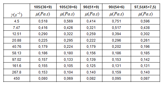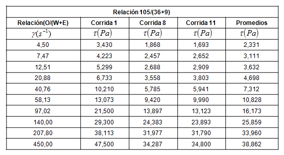 A partir de los valores de esfuerzo cortante y conociendo que la viscosidad aparente es la relación entre en esfuerzo cortante y el gradiente de velocidad 2 y teniendo en cuenta que las relaciones (90/(54+6)) y (97,5/(45+7,5)) mantienen una distribución normal y entre ellos no hay diferencias estadísticas significativas, se le realizó el mismo procedimiento que a la relación (105/(36+9)) por lo que a continuación se muestra la tabla 2 con un resumen de los valores de esfuerzo cortante para cada gradiente de velocidad.