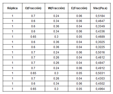 Atendiendo las fracciones de cada uno de los componentes presentes en la mezcla y los valores de viscosidad media para cada uno de los análisis, en la tabla 5 se muestran los valores de viscosidad promedio. El análisis del diseño experimental se realizará con ayuda del programa STATISTICA 7.