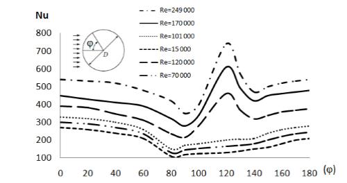 Las peculiaridades de transferencia térmica en el flujo transversal en un banco de tubos son muy similares a las encontradas en un tubo solitario. La variación de transferencia térmica alrededor de un tubo en un banco es determinada por el patrón de flujo, que depende en gran medida de la disposición de los tubos. Así, en bancos de disposición de línea, se tienen dos puntos de colisión, lo que genera como consecuencia dos máximos de transferencia térmica. Sin embargo, en bancos con arreglo escalonado, el proceso de transferencia de calor es hasta cierto punto similar al de un tubo solitario. En la figura 3 se proporciona una comparación del cociente que surge entre coeficiente de transferencia de calor local y el coeficiente de transferencia de calor promedio, para un tubo solitario y para la tercera fila de arreglos en línea y escalonados.