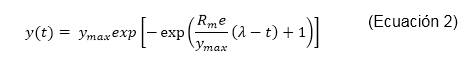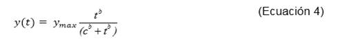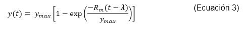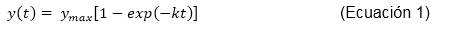 La curva representa una curva exponencial del rendimiento de metano acumulativo y(t) (L CH4/kg SV) en un tiempo dado t (d). Se estima el valor del máximo rendimiento de metano (ymax), la constante cinética de velocidad aparente k (d-1), la duración del desfase inicial (λ) en la producción de metano, la máxima producción específica de metano (Rm), el tiempo al cual la mitad del rendimiento de metano es alcanzado (c) y b es un parámetro del modelo.