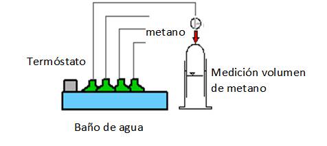 La experimentación fue realizada a escala de laboratorio en reactores de polietileno de 0,002 m3 (2 L) de capacidad, a temperatura constante y controlada de 37 ± 2 ºC. Para este fin se empleó un baño de agua con termóstato. En la figura 1, se muestra el esquema de la instalación experimental.