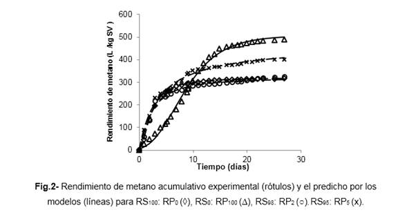 En la figura 2 se representa el rendimiento acumulativo de metano experimental y el del modelo que mejor ajustó los datos en cada caso.