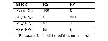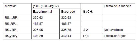 El rendimiento de metano obtenido experimentalmente para el RS, RP y sus mezclas (RS98:RP2 y RS95:RP5), y el esperado de acuerdo al rendimiento de los sustratos por separado, y la proporción de sólidos volátiles de cada uno en la mezcla, es presentado en la tabla 4.