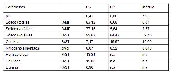 La tabla 2 presenta los parámetros analizados al residuo del secadero (RS), residuo porcino (RP) y el inóculo. El RS tiene un alto contenido de materia orgánica, expresada en términos de SV % materia fresca (MF), con un valor de 77,1 %MF, superior al RP con 5,6 %MF, debido a la presencia de micronutrientes y macronutrientes y al agua que se le incorpora a este residual durante la limpieza de los corrales.