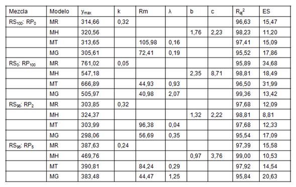 Los valores de ymax para los MH y MG son los que presentan un menor error y son los modelos que mejor predicen el comportamiento de los residuos y las mezclas.