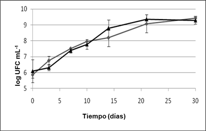 Crecimiento bacteriano El crecimiento bacteriano fue determinado por conteo de viables en placas Petri con agar nutriente; las cajas se incubaron a 30°C y el conteo de las colonias se realizó después de 48 h. El crecimiento bacteriano se expresó como Unidades Formadoras de Colonia.