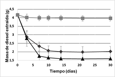 Al final de la cinética, para el medio ME quedó aproximadamente 2,00 g de diesel, alcanzándose el 53 % de remoción del hidrocarburo. Sin embargo, en el medio MSE quedó 1,59 g de diesel, para el 62 % de remoción.