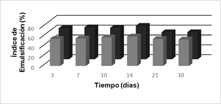En la figura 3 se muestra el comportamiento del índice de emulsificación correspondiente a los experimentos con los dos medios de cultivo (ME y MSE). En ambos medios existió un comportamiento similar, donde crece el índice de emulsificación para luego disminuir el día 21 y permanecer prácticamente igual hasta el final de la cinética. El mayor valor de índice de emulsificación se logró el día 14 con 68,4 % para el MSE y 65,7 % para el ME.