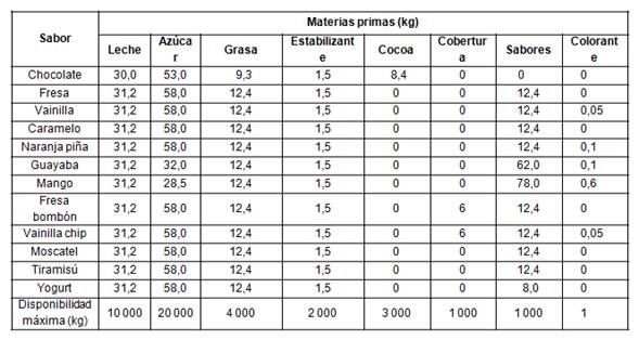 La disponibilidad de materia prima en la fábrica para un mes y el consumo de ellas se muestra en la tabla 1.Dichos consumos son valores ficticios pues por secreto comercial no se divulgan las proporciones reales de los ingredientes.