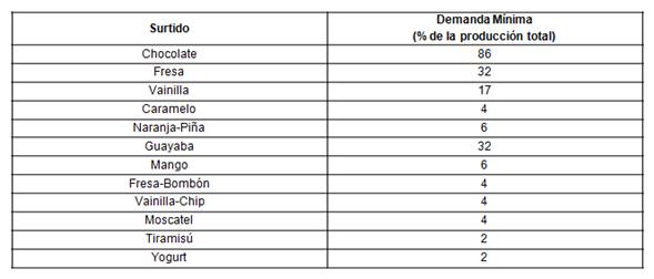 En la tabla 2 se muestran las demandas reales de los clientes por cada sabor de helado.