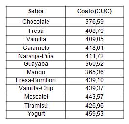 Comparando el costo mínimo obtenido a partir de la optimización, con el costo real promedio al que trabaja la fábrica actualmente que se muestra en la tabla 5, se puede observar que aunque se encuentra por encima del costo actual lo cual es lógico pues se producen sabores que son caros y que actualmente no se están produciendo, la diferencia es de 1353,19 CUC al mes.