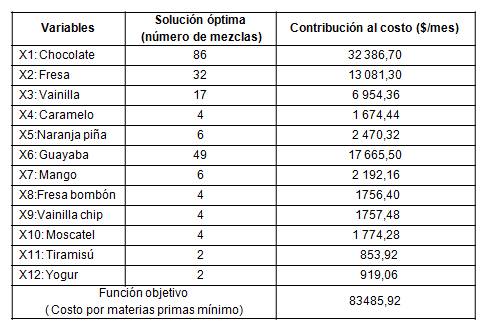 En la optimización solo se tiene en cuenta el costo de las materias primas a emplear en cada mezcla, pues se considera que el resto de los componentes del costo de producción son independientes del sabor del helado a producir.