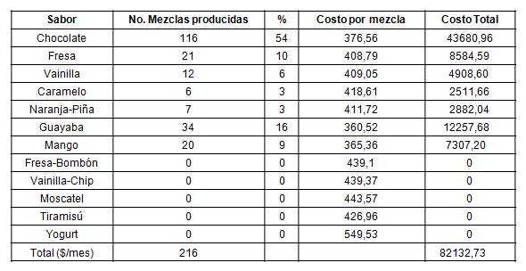 También puede observarse que aunque las producciones más altas son en los sabores más económicos que también tienen alta demanda como son el chocolate y la guayaba, se respeta la demanda de fresa a pesar de tener un costo medio y se propone elaborar durante el mes el resto de la gama de sabores que garantizaría la captación de mayores ingresos a partir de que son sabores que actualmente estos clientes adquieren de la competencia.
