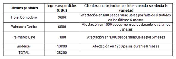 Esto significa un aumento del costo anual en 16 238,28 CUC. Sin embargo el estimado de pérdida de cliente por falta de variedades de sabores que se muestra en la tabla 6 fue de 28 200 CUC durante el año anterior, por lo que a pesar de aumentar el costo en la producción propuesta, se lograría recuperar estos clientes y además habría una ganancia de 4 372,56 CUC al año, que podría incrementarse con la incorporación de nuevos clientes que exigen más variedad de sabores que la que existe actualmente.