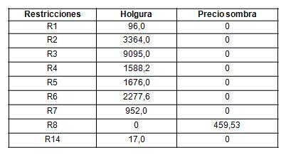 En la tabla 7 se muestran los valores de holgura y precios sombra para cada restricción. Dada la holgura que tiene la restricción de plan de producción o capacidad es posible elaborar 96 mezclas más. Esto es favorable para la planta pues significa que está en posibilidades de dar respuesta ante el incremento de la demanda.